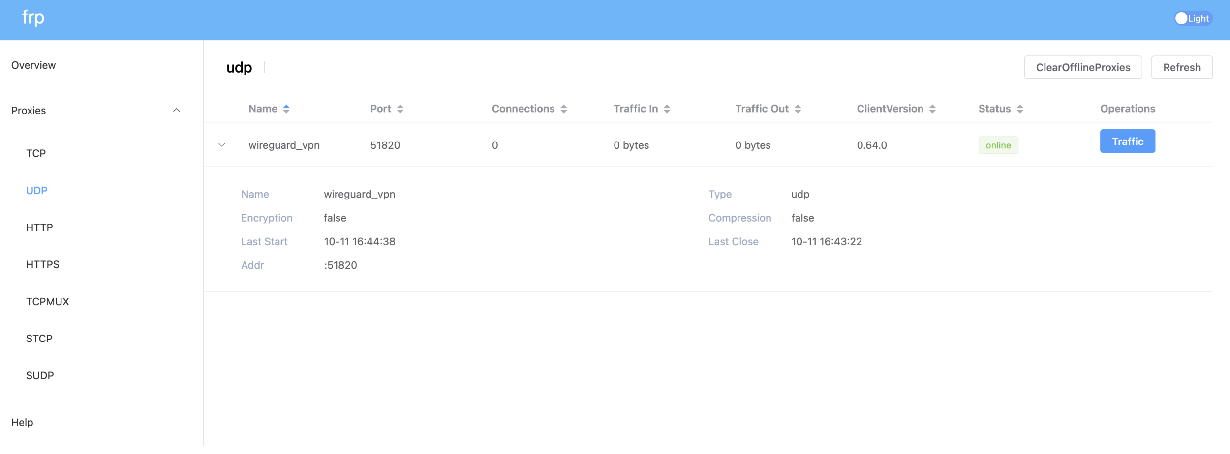 The setup of frp follows the same configs in the README (very thorough) with an added section for Wiregaurd: